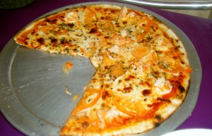 I love good Italian-style pizza and, while it is really hard to find in MSN, there is tons of it in SXM! This is a picture of the shrimp pizza we shared at Orange Fever, which is a little beach bar on Orient Bay Beach (one of maybe two dozen such bars — they all rent chairs and umbrellas for the day, serve drinks and food). I had never considered shrimp on pizza before, but we had had it the day before at Rancho del Sol. We had stopped at Rancho del Sol while we were out exploring and were desperate for food. Once we got there, though, we weren’t really feeling the menu, but we decided to split the shrimp and scallop pizza. Maybe it was just because we were ravenous, but holy cow was it super good. The pizza was divine and the shrimp were just perfectly grilled and scrumptious (the scallops were really not much to write about). Anyway, so we went for it again at Orange Fever and while it wasn’t as tasty, it was pretty yumsville.