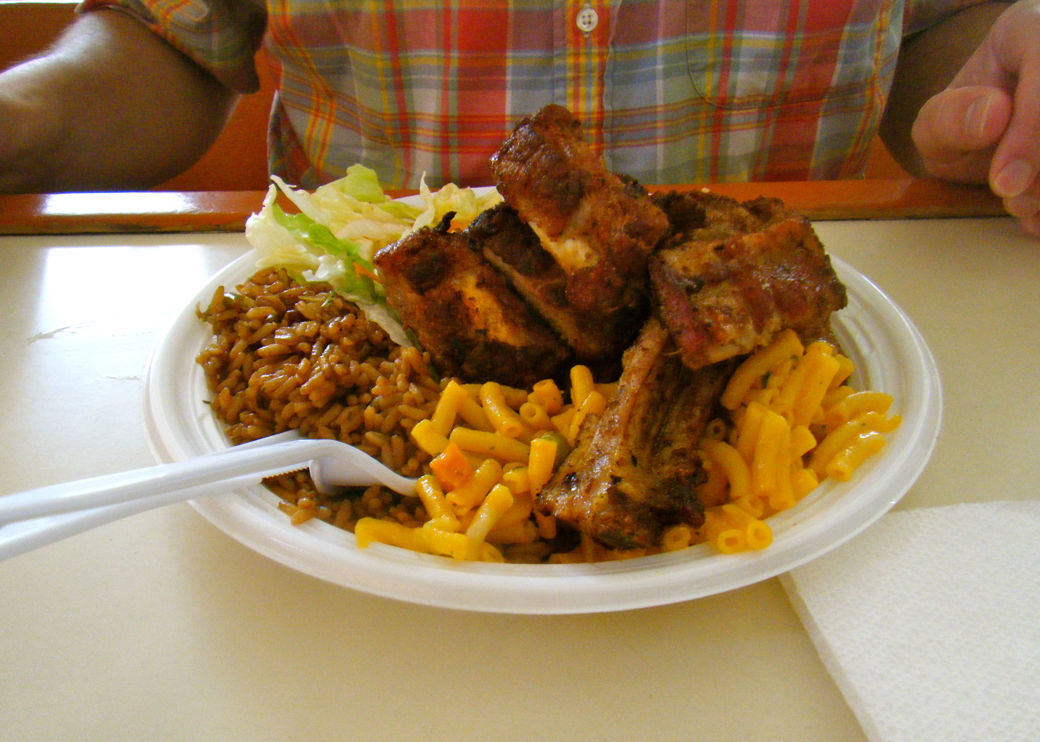 This first pic is from Talk of the Town, which is a lolo in Grand Case, a town on the French side of the island. A lolo is a restaurant that is housed around a big grill on which tons and tons of barbecue is prepared. Here, Aaron had barbecue ribs with rice and beans, green salad and macaroni and cheese for $8.