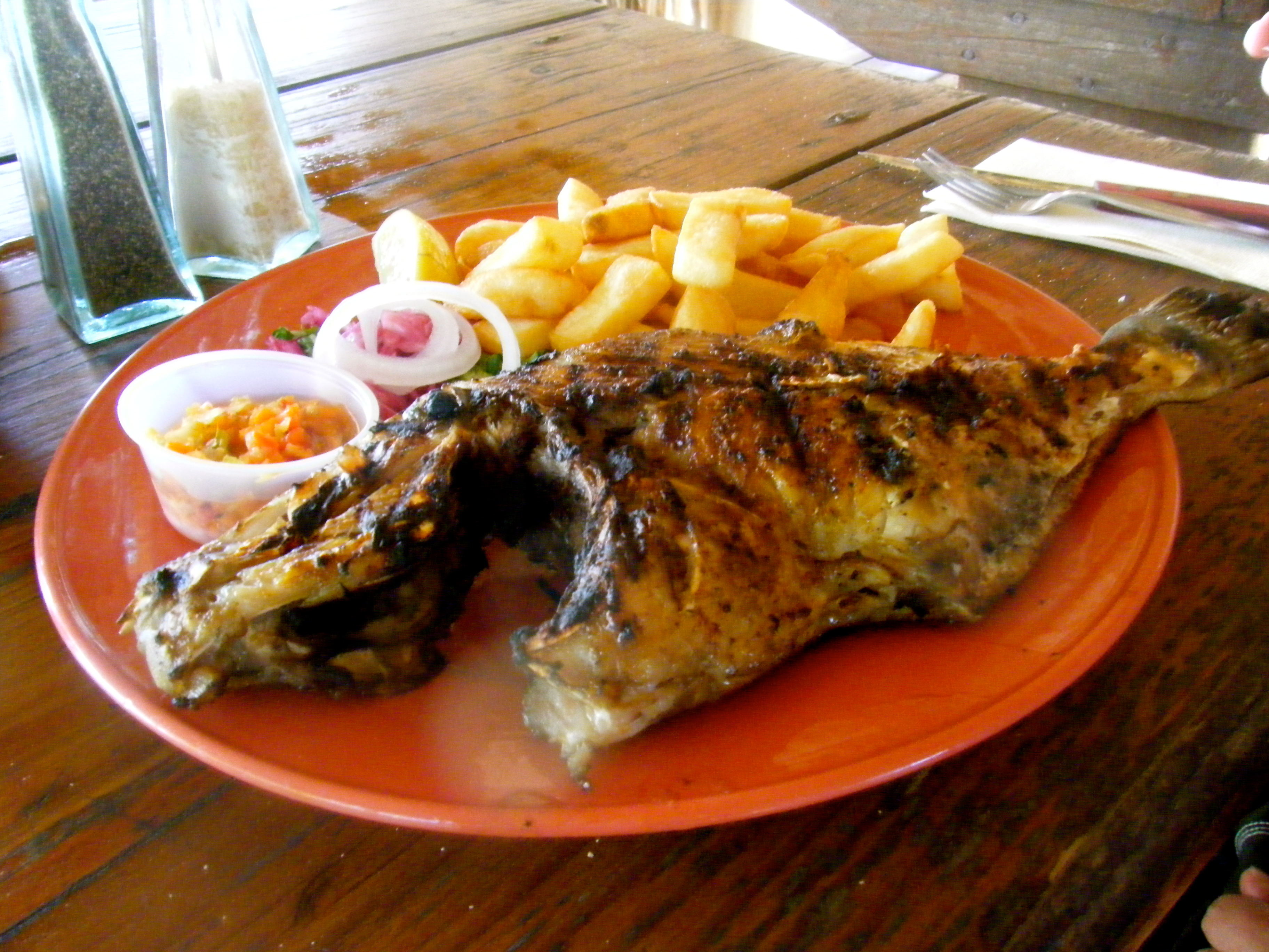 This pic is of Aaron’s lunch at Yellow Beach, which is one of three restaurants on Pinel Island. Pinel Island is a teeny tiny island, also on the French side, and a short ferry boat ride from Cul de Sac (around $7 round trip). This was our most expensive meal, but the trigger fish — shown here — was on special and was unbelievably tasty.