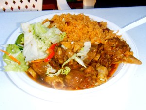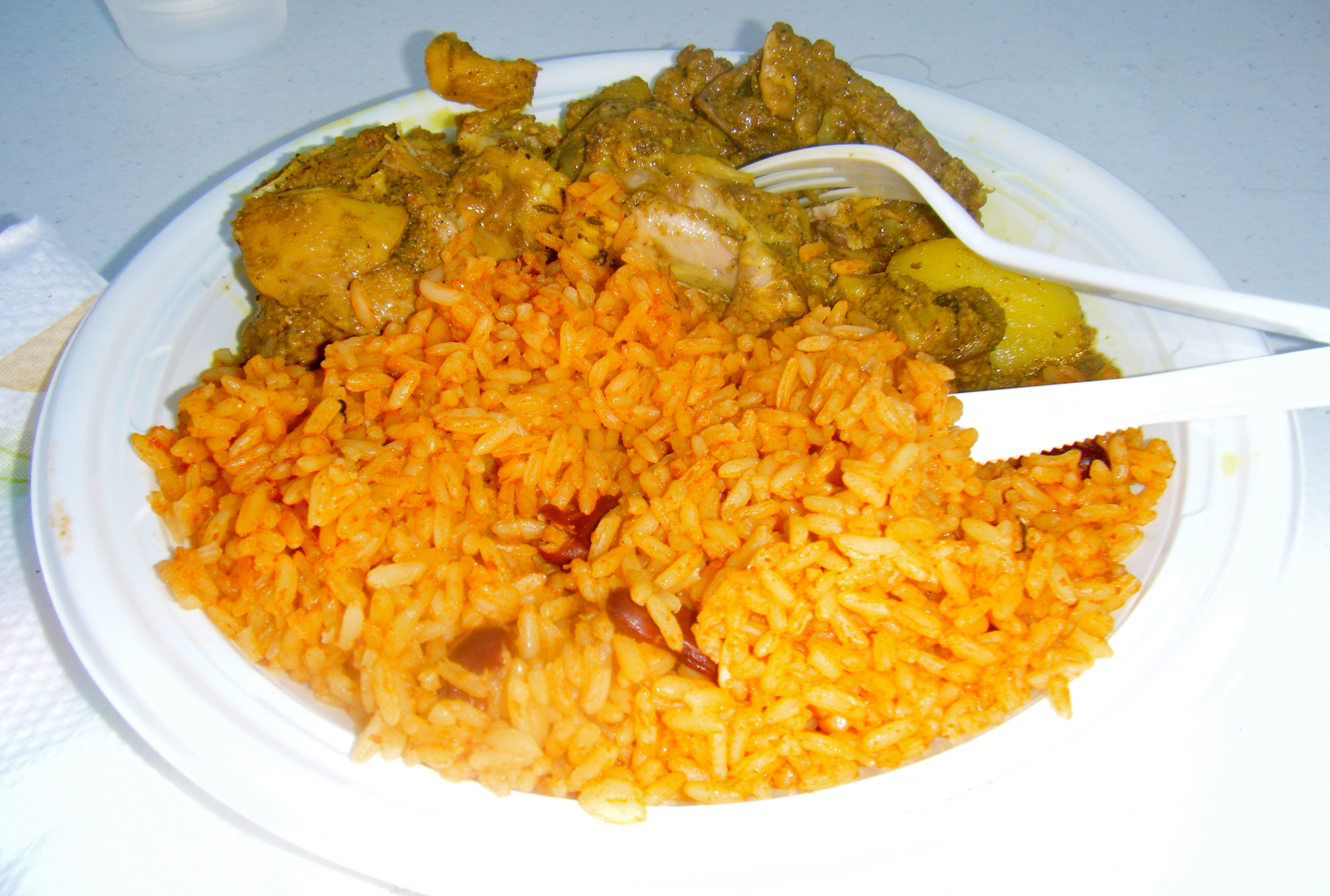 On Tuesday nights in Grand Case, the main street shuts down to car traffic (why it doesn’t prohibit car traffic every day on this incredibly narrow, one-way street with no sidewalks and a billion restaurants is a mystery) and has a sort of general party. There’s music and vendors in the street and people are everywhere. After returning from Anguilla, we stopped in the town and circled the one known parking lot for a spot to no avail. It was early yet, so we were able to find one just outside of town at not too great a distance (distances should be measured in whether you are wearing flip flops or not — had I been wearing tennis shoes, it would have been no distance at all). We walked into town and found a spot at another lolo (it seems there are at least four clustered together on the northeastern side of the main street), The Rib Shack. I ordered a $3 rum punch and Aaron ordered a $2 Carib and we watched the sunset. For dinner, Aaron tried to order the goat, which was a Tuesday night special. No goat. Instead, oxtail, which is what you see in the above picture. I had the curried chicken, another special, shown below. Yum.