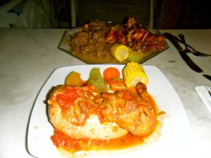 For our last St Martin meal (besides airport food), we ate at the esteemed Poulet d’Orleans. Apparently, Anthony Bourdain has declared a person who has the opportunity to eat at Poulet d’Orleans and passes on it, “too dumb to live.” I think this is a bit harsh, especially because the restaurant’s location is a bit enigmatic. We spent almost the first week of our vacation thinking the restaurant was an unrelated bar that sits next to the restaurant. And I don’t think we are the only ones who have made that mistake. When we dined at Poulet, we chatted with another American couple who didn’t actually admit that they had trouble figuring out what was where, but stated that the previous year they had had dinner at the bar (this also seemed weird as we had had drinks at the bar and there didn’t seem to be any food. Or a bathroom — we peed in the woods in the back of the bar). Anyway, we ordered the rib plate — beef, lamb and pork — and the signature poulet. I cannot describe how good this food was. The meat was amazing, of course, but I really noticed the unbelievable deliciousness when I bit into my small piece of corn-on-the-cob. The corn had soaked up all of the amazing juices and sauces that had been on the plate and the flavors exploded in my mouth. When I tasted that corn, I am pretty sure my eyes rolled to the back of my head. Heaven.