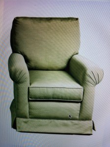 So, on Friday night, after writing my last blog post, I spent almost six hours looking at nursery gliders online. This may not have been so excessive, but I had already spent at least this amount of time looking at most of these same gliders on various other nights over the last couple of weeks. Basically, I was glider-ed-out and felt resigned to buy something I wasn’t in love with in order to close the book on the Glider Chapter of my life. I felt we had two final options: buy a made-in-the-US Little Castle Valentino glider in Pebble Grey (a soft, light grey ) fabric from the Posh Tots site for about $500 (which would take about 5-6 weeks to arrive, according to their website) or trek around to local furniture stores in the slim hope we could find something better that also wouldn’t take 12 weeks to arrive.