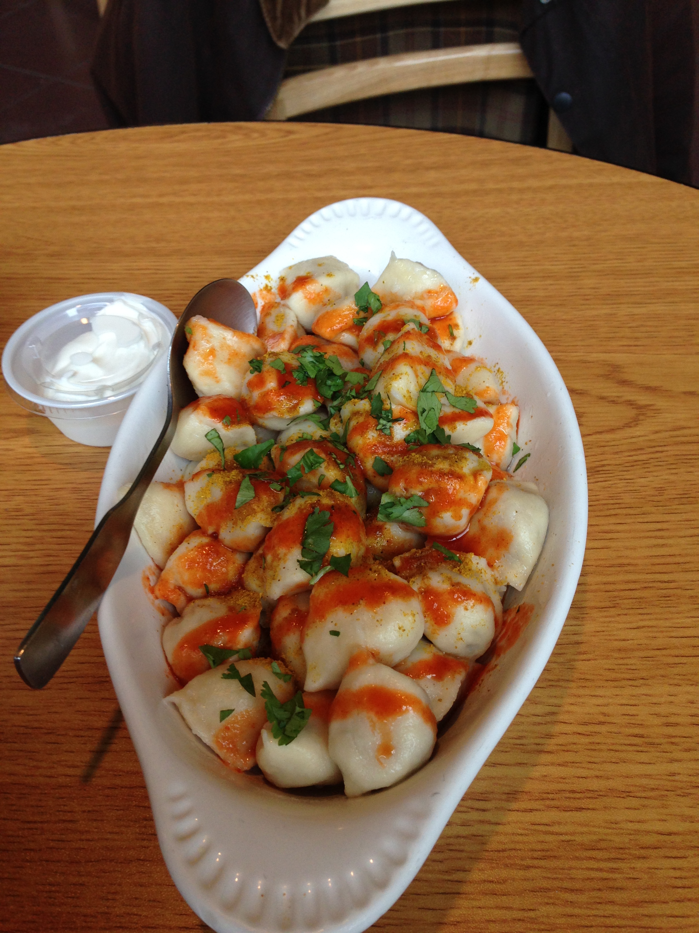 For whatever reason, today has been particularly hard. So, to distract myself from my grief, I asked AO to go on a walk with me at lunch. I wanted to walk down to the furniture store on West Wash in the hopes of finding all of the perfect pieces to fill up our new home. That didn’t happen, but I do like the shop (and am excited about the new consignment companion shop they’re in the process of opening) and the walk was nice. On the way back up the hill to work, I suggested we take a detour and check out Paul’s Pel’meni restaurant that we always talk about going to, but never do. It was sort of a strange choice for me because I ate AO’s homemade pelmeni the night before. But, really, who could ever eat enough dumplings? Actually, at this very moment, I’ll say that I am dumpling-sated. Maybe even saturated. These dumplings are taste-a-licious, though, and I highly suggest you get over there and get yourself some.