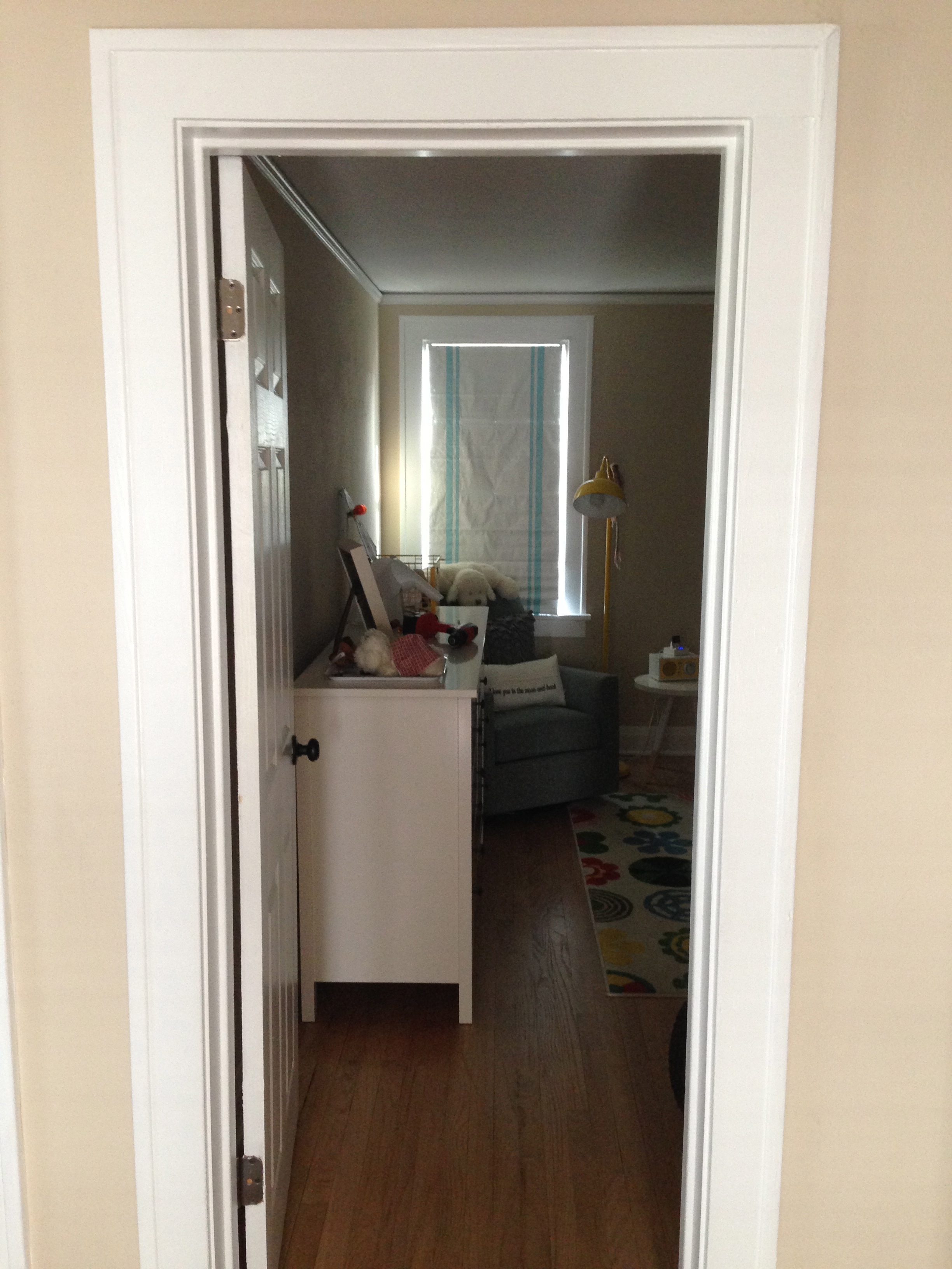 So, I ordered a roman blackout shade from Pottery Barn Kids on Thursday and it was at our door when we came home on Friday. I was a little freaked out by the speed of the delivery, and the lack of a packing slip, but not enough to let it stop me from asking AO to sub out the abandoned house-style blind for a creamy new white one with an aqua blue stripe. And this morning, we got this: