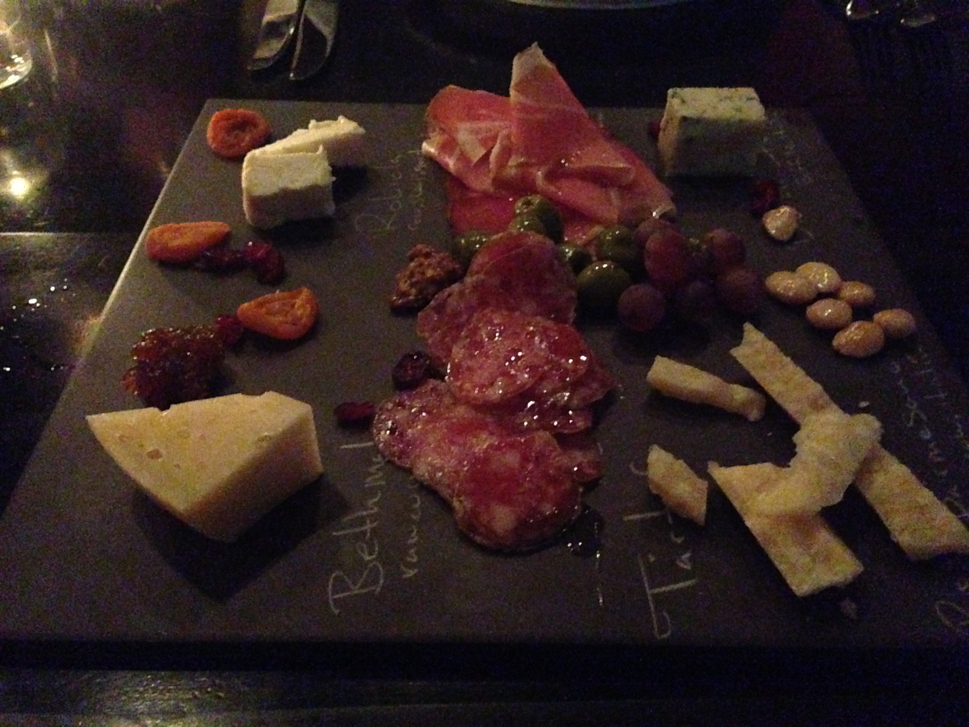 After lunch, we went back to SR’s apartment, showered and changed and headed out for a Dress Appointment. This Dress Appointment was just supposed to be to get the feel of things. We were just supposed to be seeing what she liked, what she didn’t like. You know the drill. In fact, we were supposed to be just scoping out the bridal world so we could go back to SR’s stylist friend and report our findings so he could come up with something perfect (and possibly free). Instead, we found The Dress. Gulp! First dress she tried on. Bam. Nailed it. Done and done. But first, we let the shop treat us to a little Prosecco. Cheers! After such an exhausting emotional afternoon, we headed back to SR’s apartment (after a short stop in a cute furniture store where we saw the First Lady of tv) for a little rest. I admit I snoozed a bit. For dinner, we went to SR’s favorite place, Cube, where we dined with SR’s fiance. I had a super pizza and a side of delicious baby broccoli with garlic. I forgot to take pics of it, but here is the tasty charcuterie plate we started with:
