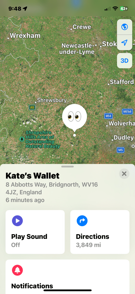 I dropped my wallet in Heathrow, Terminal 5, on April 4, on our return from Nice. I noticed I had lost it shortly after I did so, but it was too late for me to retrace my steps. We’d already gone from one gate in the terminal to another, and we were very nearly boarding (or so I thought), so I let myself watch it wistfully via the “Find My” app on my phone, using my AirTag for the first time. AO quickly discovered that Heathrow had a lost and found website and within a day, I had located on the site what I assumed was my wallet and made a claim for it. Nothing happened for days and days. I tweeted @Heathrow, received an email address to try, and still nothing. I tried another website and nothing. Finally, after what seemed like months but was probably 10 days, I received a cold email with a code to enter on yet another site so that I could begin the process of bringing my wallet home. At this point, I had already ordered–and received–new debit and credit cards and a new drivers’ license. I had spent $16 to replace these items, but I was out a wallet, an AirTag, and a work security card. I filled out the form on the new site with the code, entering the info to have the wallet sent to me across the pond. Beep beep bloop beep boop. The total for such a service? 133 pounds. Or about $170. Er, record scratch. WHAT?!?! That seemed insane to me. It doesn’t cost anywhere near $170 to mail a tiny package across the Atlantic. Does it? So, I said, no way. And here is where my wallet sat.