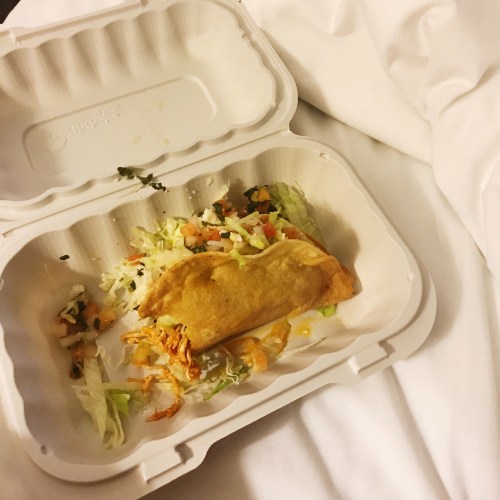 As you can probably see, its first claim to fame is that it’s in a hard shell. And it’s clearly a homemade shell, so it’s interestingly, non-uniform in shape. And divine. It’s then filled with juicy, flavorful, shredded chicken, iceberg lettuce, crumbly queso fresco, and pico de gallo. Simple? Maybe. But perfect. I also got to eat it in bed while we chilled out after a long day of travel and enjoying the California sun. Dream-y. In fact, I’ve been dreaming about this taco since it came into my life. If you have the option of Los Arroyos, take it.