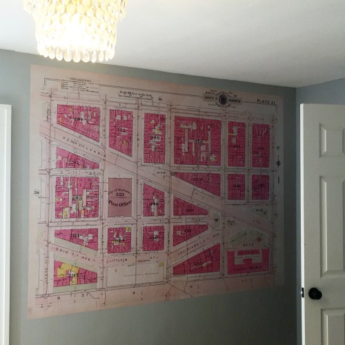 It’s a 1909 map of DC in 4 panels that overlap each other. It’s also slightly uneven because I’m not so great at patience (up half an inch on the right side) and our floors and walls and whole house is wonky. I. Love. It.