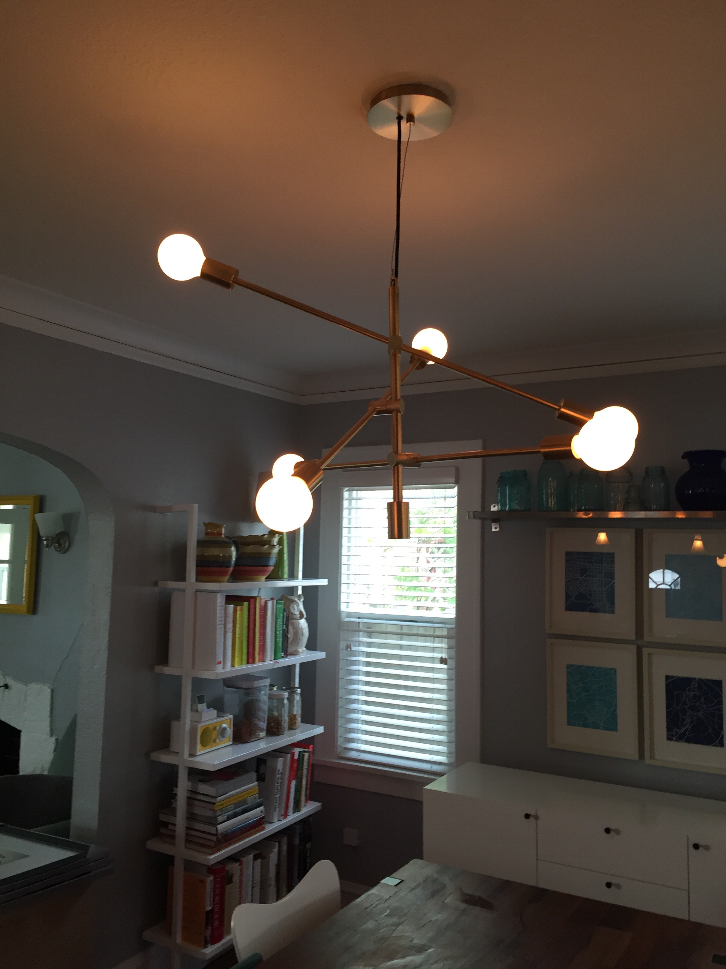 I’m struggling with a decent pic because the rest of the room was messy, but here you go. It’s brass and it kinda unites the milky white and brass one in the adjacent front room. It also LIGHTENS (as in weight-wise) the room immensely. I hadn’t realized until recently just how oppressive our other fixture had been. I don’t want to speak ill of dead-to-me like fixtures but Oy. It’s pretty, I guess, but didn’t work well in our small space. Or, you know, any space that gets dust. Or that is near a kitchen that is used.